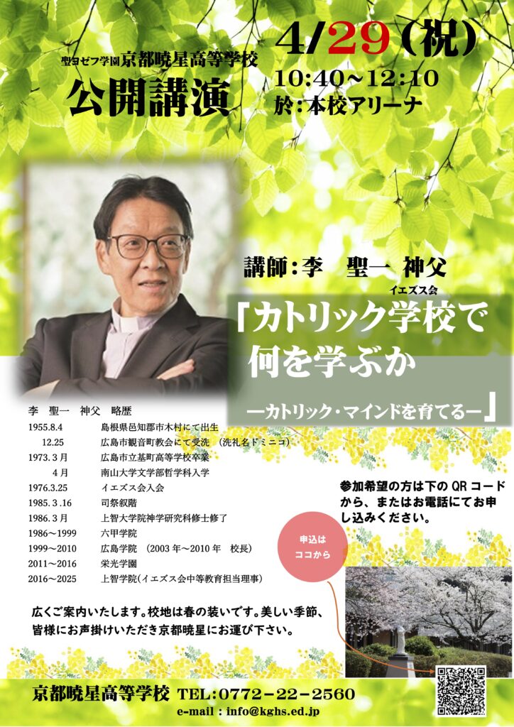 この日は全校生徒の登校日で,1限が授業参観,2限からPTA総会が行われ,その後,PTA主催の公開講演が開かれます。今年度はイエズス会の李 聖一 神父様をお迎えして,「カトリック学校で何を学ぶか 〜カトリック・マインドを育てる〜」をテーマにお話していただきます。李神父様は,六甲学院・広島学院・栄光学院とイエズス会の中高一貫校で30年間教壇に立ち,2003年から2010年には広島学院中学高等学校の校長も務められました。イエズス会司祭でありながら教育者として歩まれた豊かな経験から語られる言葉は,暁星教育の根幹に迫るものです。私たちが生徒たちに日々行っている教育とは何か,カトリックマインドとは何かを知る貴重な機会です。保護者の皆様はもちろん、本校の教育に関心をお持ちの方も、ぜひご参加ください。
