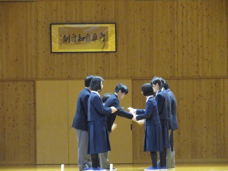 任命式の前には、現生徒会本部役員の退任式が執り行われ、現生徒会長から挨拶があり、1年間の活動の総括、支えて下さった方々への感謝の言葉が述べられました。その後、現生徒会から任命証が新生徒会に手渡され、新生徒会長からの就任の挨拶がありました。