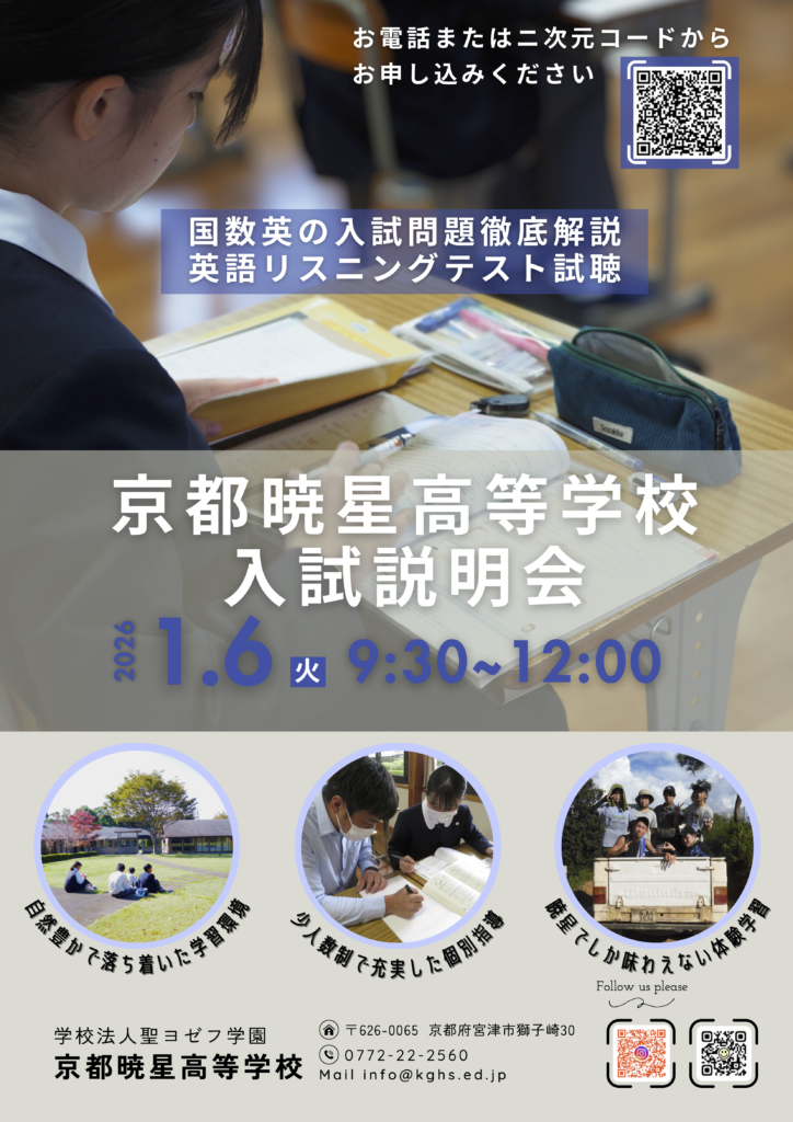 2026年1月6日(火)9:30〜12:00に入試説明会が行われます。この日は,国数英の3教科の担当の先生が入試問題を徹底解説します。特に,英語では過去のリスニングテストを試聴できる唯一の会ですので,暁星を受験される予定の方は必ず参加してください。